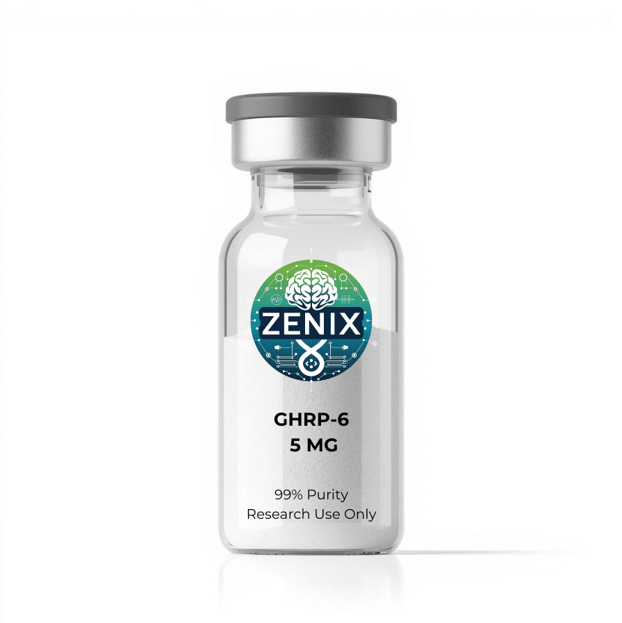 GHRP-6 (Growth Hormone Releasing Peptide-6) is the pioneering synthetic hexapeptide in the growth hormone secretagogue class, developed in the 1980s from met-enkephalin analogs. It potently stimulates GH release through ghrelin receptor activation while also significantly increasing appetite via ghrelin-mimetic properties. GHRP-6 stimulates phosphatidylinositol turnover, activates protein kinase C, and mobilizes intracellular calcium stores. Beyond GH secretion, research indicates cytoprotective effects on cardiac tissue and wound healing properties, making it valuable for tissue repair investigations.