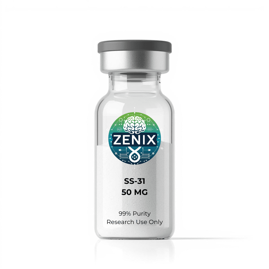 SS-31 (Elamipretide, Bendavia) is a small aromatic-cationic tetrapeptide specifically designed to target and concentrate in the inner mitochondrial membrane. It binds to cardiolipin and stabilizes cristae structure, improving electron transport chain efficiency and reducing reactive oxygen species production. SS-31 has shown promise in research on heart failure, neurodegenerative diseases, and aging.